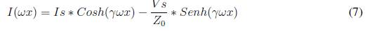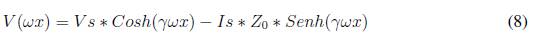 La solución de las ecuaciones de línea (5) y (6) de utilidad en problemas numéricos, utiliza funciones hiperbólicas en función de la longitud x de la línea y la frecuencia u, como aparece en las ecuaciones (7) y (8).