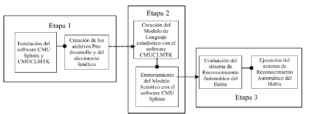 Se uso como base el sistema embebido Raspberry Pi B+ con la distribución Raspbian de Linux, en donde se instala el Toolkit de Reconocimiento del habla CMU Sphinx. Inicialmente, se opera con el CMUCLMTK para generar los modelos de lenguaje, posteriormente con el SphinxTrain se ejecuta la tarea de entrenamiento del modelo acústico y finalmente con el SphinxBase y el PocketSphinx se comprueba el funcionamiento de los modelos obtenidos usando el micrófono de un smartphone y una aplicación móvil como entrada de audio.