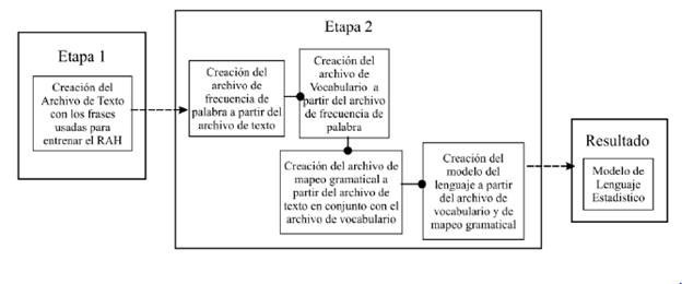 El proceso de creacion de un Modelo del Lenguaje Estadístico se inicia al crear en primer lugar el archivo de frecuencia de palabra. Dicho elemento permitiraí crear un archivo de vocabulario que obtendra todas las palabras que componen el texto que se utiliza para la creacion del modelo del lenguaje. Con el archivo de texto en conjunto con el archivo de vocabulario, se obtiene el archivo de mapeo gramatical. Con este archivo y los archivos de vocabulario se puede realizar la creacion del modelo del lenguaje necesario para el entrenamiento del modelo acustico y el funcionamiento del RAH, este proceso se muestra en la Figura 3. Dicho proceso es inherente al software CMUCMLTK y todos los archivos mencionados con anterioridad en esta seccion son resultado del funcionamiento del mismo, cabe resaltar que el archivo de vocabulario del cual se habla en esta seccion, solo cumple una funcion en la creacion del modelo de lenguaje y no se encuentra de ninguna manera relacionado y su contenido es diferente al del archivo de vocabulario expuesto en la seccion de preparacion predesarrollo.