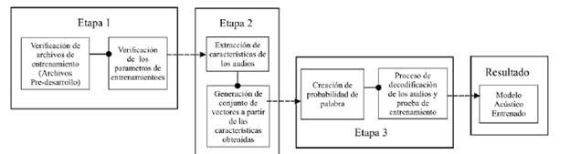 El modelo acústico se entrena en tres etapas como se representa en la Figura 4. En la primera parte el sistema verifica los requisitos del entrenamiento con el fin de determinar y comprobar que se encuentren en orden los archivos de pre-desarrollo necesarios en el entrenamiento. La segunda parte es la extracción de características en la cual se divide la señal en segmentos para realizar un procesamiento de dicha señal, extraer sus características y generar un conjunto de vectores como resultado del análisis realizado por el software SphinxTrain.