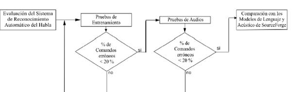 La evaluacion de los modelos acustico y de lenguaje se realizo tal y como se muestra en la Figura 5, analizando primero los resultados de entrenamiento, los cuales son producto de la parte final del proceso de entrenamiento del modelo acustico, seguidos de pruebas del sistema de RAH con audios realizados por nativos de la region, de manera extraoficial se realizaron pruebas con acentos diferentes al de la region de Cucuta para comprobar el posible escalamiento del proyecto a nivel nacional.