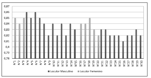 La tasa de acierto obtenida con los modelos desarrollados es del 83 %, la cual se obtuvo al promediar la tasa de reconocimiento individual de 30 personas con las que se llevaron a cabo la evaluacion de los modelos. Cada persona probo el sistema con quince comandos para un total de 450 archivos de audio, esta informacion se puede encontrar en la Figura 7. Todos los hablantes son originarios de la ciudad Ctúcuta, excepto el No. 1 y No 2 que son de Lourdes y Gramalote respectivamente.