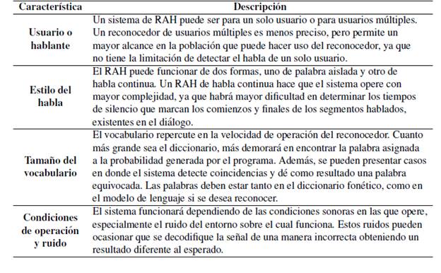 Un sistema de RAH tiene varias características que sirven de igual manera para clasificar la forma en que funcionan y trabajan la información que entra al sistema, como parte de la interfaz de acceso por habla. En la Tabla I se describen las características de un sistema RAH.