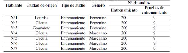 En la Tabla III se relacionan las personas empleadas para el entrenamiento con su ciudad de origen, el sexo y la cantidad de archivos empleados para ejecutar el entrenamiento de los modelos y las pruebas de los mismos.