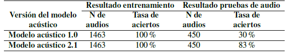 Esto fue solucionado regrabando los archivos, logrando alcanzar en la versión 2.1 tasa de acierto en el entrenamiento del 100 %. A la versión 2.0 no se le realizo prueba de audios debido a que los resultados de entrenamiento del modelo acústico presentaron una exactitud inferior al 80 %.