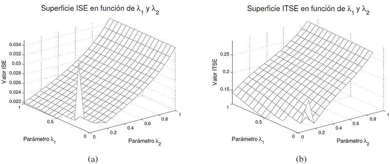 donde e(t) = Href - h(t) es el error de nivel y Ts es el tiempo de simulación. Estos criterios de un solo número dan cuenta del cuadrado del error en el tiempo. El primero favorece sistemas con respuestas que se acercan a una referencia dada, mientras que el segundo, por tener en cuenta el tiempo usado para alcanzarla, es menor para sistemas que lo hacen rápidamente. La Figura 12 muestra cómo cambian los anteriores índices de desempeño con la variación de los parámetros λ1y λ2.