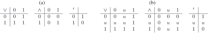 Definición 1 (Lógica trivalente de Kleene). Se denotara por K el álgebra de valores de verdad (K= {0,1/2,1} ; V, Λ,', 0,1), con el orden usual para sus elementos (0 < 1/2 < 1), donde las operaciones disyunción (V) y conjunción (Λ) entre a, b єK están dadas por a V b = max {a, b} y a b = min {a, b}. El complemento (') de aє K es a' = 1 - a. También se identificara el elemento 1/2 con la letra u. En la Tabla I(b) se muestran estas operaciones lógicas actuando sobre K.