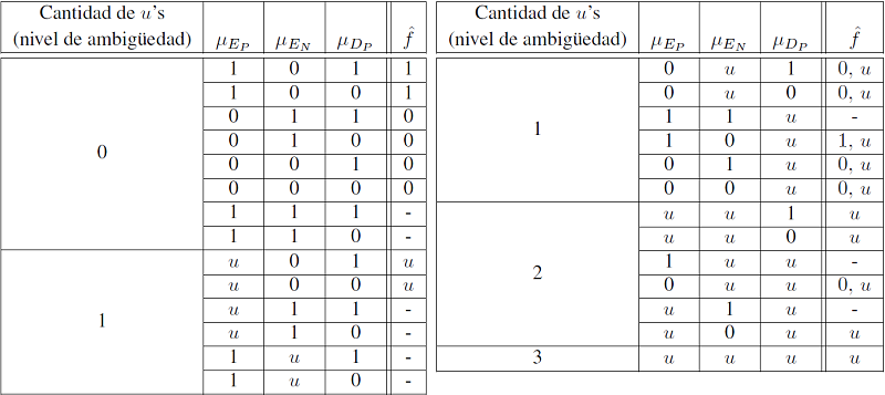 En este paso es posible realizar una codificación trivalente de todas las posibles regiones de operación mediante una tabla de verdad de lógica trivalente (0, u y 1), basados en la partición descrita anteriormente. Cada codificación corresponderá con una fila de la tabla. Esta codificación trivalente debe preservar en su totalidad la codificación bivalente obtenida en la primera etapa. De esta forma la tabla de verdad de lógica trivalente es una extensión de la correspondiente de lógica bivalente