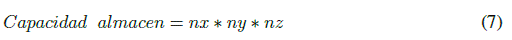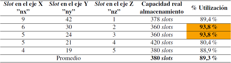 Los espacios necesarios de almacenamiento (slots) determinan la capacidad total de almacenamiento, el cálculo de estos se obtiene mediante la aplicación de la ecuación (2) y (3). Los resultados obtenidos integran decimales que deben ser aproximados. En este caso, el diseñador debe ajustar al máximo o al mínimo dependiendo de la capacidad de almacenamiento que desee, es decir, evitar subdimensionamiento o sobredimensionamiento del almacén de acuerdo con las tendencias de demanda de los productos. Para el cálculo de la capacidad de almacenamiento se aplica la ecuación (7) en la que interviene los slots en los tres ejes X-Y-Z .