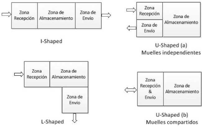 En el artículo [4] se sugieren modelos que minimicen la distancia total de recorrido de los recolectores en almacenes tipo flujo (I-Shaped) y tipo U (U-Shaped) para determinar su tamaño, donde el número de muelles es la primera etapa del diseño del almacén al ser uno de los factores que más afectan la distancia media de viaje del selector y el tráfico de entrada y salida de los camiones; por lo tanto, se determinan los tamaños del almacén de acuerdo con los números de muelles (receptores y embarque) para cada tipo de almacén. Además, en el artículo [16] se caracteriza el proceso de almacén presentando un enfoque para seleccionar la estrategia de almacenamiento, ya que esta depende de factores técnicos y organizacionales como es el tipo de tareas básicas, la estructura y el tamaño de las ordenes de los clientes, los costos de manipulación de los materiales, disponibilidad de espacio de almacenamiento, recursos laborales, entre otros.