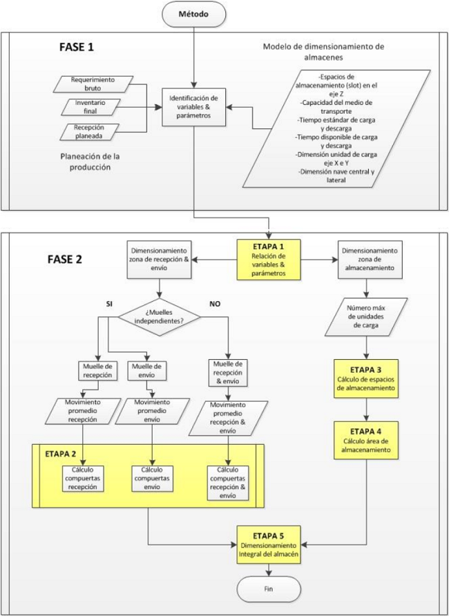 Método: Se presenta un método de dimensionamiento de almacenes compuesto de dos fases. En la primera se definen variables y parámetros que son obtenidos a partir del proceso de planeación de la producción; en la segunda, se desarrollan cinco etapas que culminan con el diseño integral del almacén, en la cual se aplica un modelo matemático de dimensionamiento existente que incorpora una nueva ecuación.