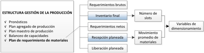La primera etapa “relación de variables y parámetros” considera la información recolectada en la primera fase para identificar los datos de entrada que son necesarios en el modelo de dimensionamiento, específicamente el inventario registrado en el MRP es una variable de entrada que determina la cantidad de unidades que se almacena a lo largo de un periodo; posterior a esto, se aplica un factor de conversión para calcular el número de espacios (slots) necesarios para el almacenaje, en el que es necesario contemplar restricciones de disponibilidad de áreas en la zona de almacenamiento y las dimensiones de las unidades de carga (longitud, ancho y alto). Asimismo, el requerimiento bruto como la recepción planeada son variables que determinan el movimiento promedio de materiales en el muelle de carga y descarga (plataforma), que, junto con las características técnicas del medio de transporte (capacidad y tiempo), determina el número de compuertas requeridas en la zona de recepción del almacén. La relación de variables entre el plan de requerimiento de materiales y el modelo de dimensionamiento del almacén se presenta en la Figura 3.