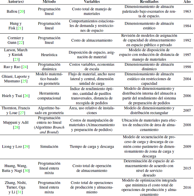 En la Tabla I se presentan algunos aportes y avances relevantes que están relacionados con el dimensionamiento de almacenes.