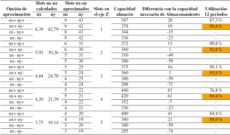 Los resultados en la Tabla X presentan diferentes alternativas de configuración que pueden adoptarse al diseñar la zona de almacenamiento. Al aplicar las opciones de aproximación, es evidente que algunas deben ser descartadas, por ejemplo, en las primeras cuatro filas que corresponden a la asignación de un slot en el eje Z, la tercera y cuarta aproximación generan una capacidad real de almacenamiento de 344 y 336 slot estando por debajo de la capacidad necesaria (359 slot). Por esta razón, serán una opción de descarte debido a que para algunos periodos no habría espacio para almacenar materiales. Por lo contrario, la primera y segunda aproximación genera una capacidad superior a la capacidad necesaria, obteniendo un 87 % y 89 % de utilización proyectada para doce periodos. A partir de lo anterior, la configuración seleccionada para el almacén con un slot de altura (nz = 1) es nx = 9 slot, ny = 42 slot , debido a que es la que presenta mejor utilización proyectada. En la Tabla XI se presentan los resultados finales que establecen la configuración seleccionada de almacenamiento para cada nivel nz .