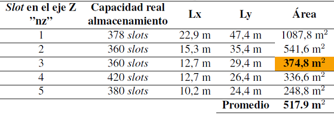 De acuerdo con la Tabla XI, las mejores configuraciones eran las que correspondían a 2 y 3 slot de altura; sin embargo, en la Tabla XII se puede identificar que por área necesaria se escogería la configuración de 3 slot de altura, debido a que requiere menor área proyectando una menor inversión en su infraestructura. El promedio general, teniendo en cuenta todos los posibles niveles de altura, es de 517,9 m2.