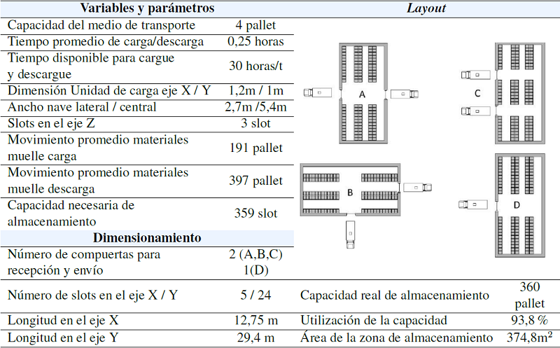Teniendo en cuenta lo anterior, el primer conjunto describe los parámetros que se fijan para un determinado problema del almacén, estos parámetros se refieren a características como el numero requerido de ubicaciones de pallets, el número de referencia (SKU), los requisitos de rendimiento, entre otros; en cambio, el segundo conjunto son valores asociados con las opciones de diseño, haciendo referencia a variables de decisión como la forma del área del almacén, la configuración de la puerta del muelle, la disposición del área frontal y el tamaño. También se proporciona un método que genera un diseño tridimensional bajo una disposición en forma de espina de pescado; este método toma la capacidad de almacenamiento deseada e informa la ubicación en los ejes X-Y-Z a un costo total mínimo. Además, se determina como característica principal de diseño la distancia de viaje, logrando hasta un 20 % de reducción en comparación con los esquemas tradicionales para almacén de carga unitaria [9]. De igual modo, en [10] se propone un diseño del almacén que mejora el proceso de búsqueda y selección de productos, además de aumentar la utilización del espacio; en este diseño se aplica la clasificación del sistema ABC en los pedidos y la técnica de programación lineal, de tal manera que determina nuevas localizaciones para los productos. Es claro que las decisiones de disposición del almacén tales como altura, profundidad del carril, ancho, ubicación de pasillo, entre otros, son importantes, ya que afectan tanto al capital de inversión como los costos operacionales.
