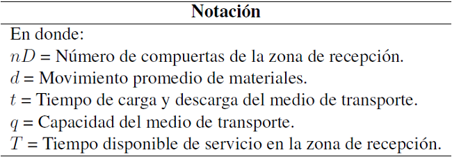 En la ecuación (1) se presenta el modelo inicial que permite dimensionar el número de compuertas que integran la zona de recepción o envío; esta ecuación contempla el movimiento promedio de materiales que es definido desde el proceso de planeación de la producción, a la vez considera parámetros previamente determinados por la organización como es el tiempo de carga y descarga del medio de transporte, la capacidad de transporte y el tiempo disponible de servicio en la zona de recepción. En la tabla II se presentan las variables de las que este modelo depende.