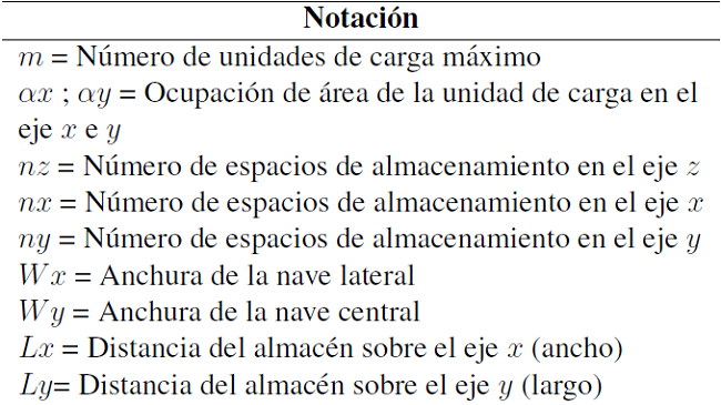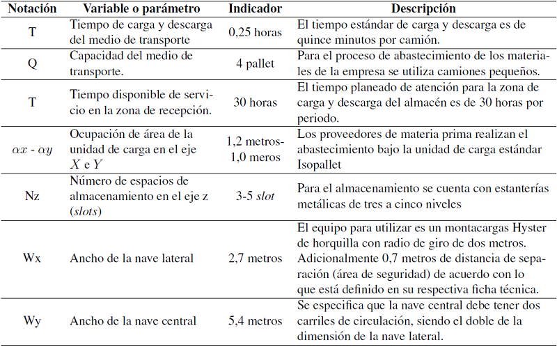 A continuación se presentan las ecuaciones que permiten calcular el número de espacios de almacenamiento (ecuaciones (2) y (3)) para determinar la distancia del almacén sobre el eje X (ancho) y sobre el eje Y (largo), con los cuales se puede obtener a su vez el área del almacén en la que incluye el área de pasillos para el desplazamiento del material. Los parámetros que integran este conjunto de ecuaciones contemplan el tamaño de la unidad de carga, el espacio entre pasillos de acuerdo con el equipo de alistamiento de pedidos y los niveles de altura en relación con el tipo de estantería a utilizar. Los parámetros del modelo se presentan en la Tabla III.