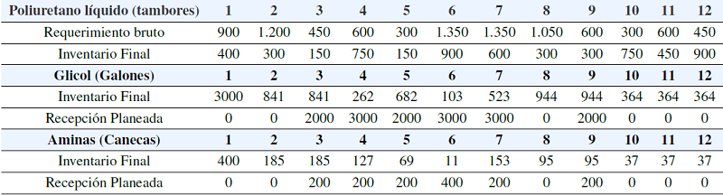 Para la identificación de variables se desarrolló un aplicativo computacional en el que se diseñaron tres módulos de información: pronóstico, plan maestro de producción y plan de requerimiento de materiales. De acuerdo con lo anterior, en el módulo de pronósticos se analizaron los datos de ventas de los dos años anteriores comparando diferentes modelos de proyección. Se identificó que el modelo que más se ajusta al comportamiento de la demanda es la regresión lineal con estacionalidad. Asimismo, en el módulo de plan maestro de producción se registraron los niveles de fabricación para doce meses, se tomó en cuenta el pronóstico en cada periodo y las políticas de inventario de producto final. En el módulo de plan de requerimiento de materiales, se ingresaron los resultados del plan maestro de producción y se tuvo en cuenta la estructura de fabricación de productos finales, las políticas de inventario de materia prima (stock de seguridad) y tamaños de lote. En la Tabla IV se presentan los resultados finales del MRP de las variables requerimiento bruto, inventario final, recepción planeada para el producto terminado y algunas materias primas, las cuales determinan el plan de recepción y almacenamiento en todos los componentes, así como la respectiva distribución para el producto terminado.