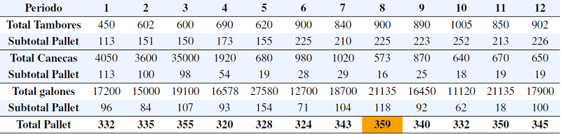 De acuerdo con la Tabla VII, se identificó que el niñero máximo de pallet en el plan de almacenamiento es de 359 pallet, al igual este número es una variable de entrada considerada para el modelo matemático de dimensionamiento de la zona de almacenamiento. Se selecciona el número máximo como capacidad necesaria y a su vez se fija a lo largo del periodo de planeación, debido a que esta se ajustaría a cualquier capacidad necesaria de otro periodo