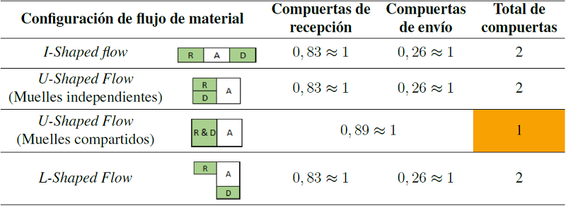 Los resultados de la Tabla IX generan el niñero de compuertas de recepción y envío para cuatro opciones de configuración de flujo. Se aproximaron los resultados al entero siguiente debido a que se identificó una tendencia positiva que va incrementando el flujo de material para periodos de tiempo futuros; en este caso, se obtiene un total de dos compuertas para las configuraciones de flujo en las que se tiene muelles independientes. Por el contrario, en la configuración de muelles compartidos las actividades de recepción y envío se alternan en una sola compuerta. La selección de configuración de flujo de material finalmente dependerá de las restricciones de espacio para construir el almacén, recomendando principalmente para este caso la configuración U-Shaped flow con muelles compartidos, dado que requiere menor inversión por ser necesaria una sola compuerta.