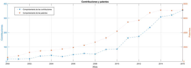 Bajo los criterios de búsqueda declarados en la sección materiales y métodos, y empleando las herramientas de investigación y análisis de estadística bibliometrica que este catalogó ofreces a sus suscriptores, se generó empleando MATLAB la Figura 1, esta destaca el comportamiento tanto de las contribuciones científicas en esta área temática, como las patentes registradas en el mismo periodo de tiempo. Se puede observar que a partir del 2010 la comunidad científica internacional marca un notable incremento en las investigaciones dirigidas a las tecnologías de acumulación térmica y sus prácticas.