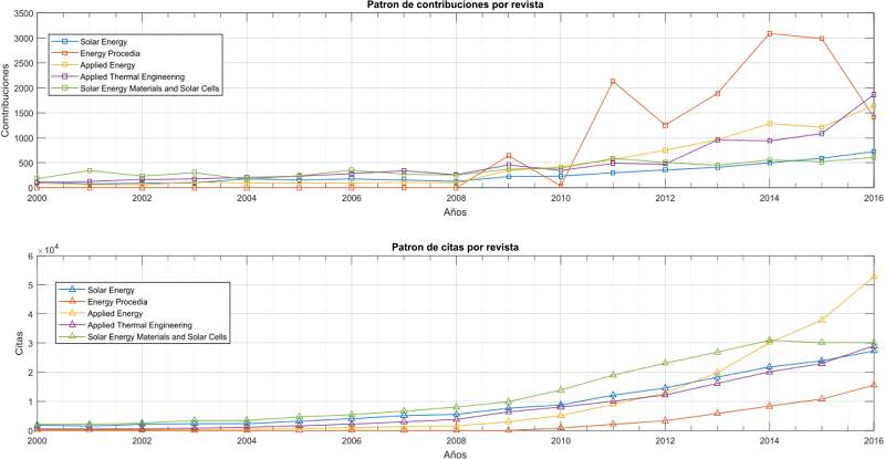 Las revistas quemás socializan esta tematica son, Solar Energy, Energy Procedia, Applied Energy, Applied Thermal Engineering y Solor Energy Materials and Solar Cells, según Scopus. La Figura 2 muestra el comportamiento del patrón de contribuciones por cada una de estas revistas del 2000 al 2016, también se muestra el patrón de citas bibliográficas por cada una de estas prestigiosas editoras científicas.