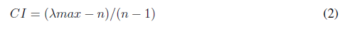 Resulta muy complicado alcanzar una consistencia exacta en los juicios para la toma de decisiones; sin embargo, es posible disminuir sus inconsistencias; con ese fin, se determina la inconsistencia global de los juicios a través de la proporción de consistencia, dicho porcentaje no debe superar el 10 %. Lo anterior obedece al tamaño de la matriz de comparaciones pareadas. El CI se calcula de la siguiente fórmula (2):