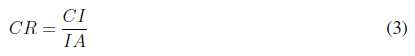 Con estos valores se determina la CR a través del cociente entre el CI e IA, tal como se muestra en la formula (3) [21]- [23]