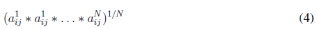 Si se compara el elemento i con el elemento j, si α1ij , α2ij ,: : :, αNij son los juicios individuales de los integrantes de los grupos 1, 2, : : :, N respectivamente, posteriormente, el valor combinado del juicio se ingresará en la matriz de comparación pareadas de los grupos [20].