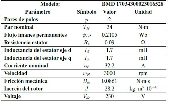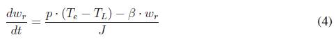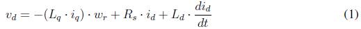 Donde vd, vq son los voltajes del PMSM en el sistema de referencia síncrono (d,q), wr es la velocidad eléctrica, Ld y Lq son respectivamente las inductancias en el eje d y q, Rs es la resistencia de estator, id e iq son las corrientes en el eje d y q respectivamente, IP es el flujo de los imanes permanentes, Te es el par electromagnético, p es el número de pares de polos del PMSM, TL es el par de cargar, β es el coeficiente de fricción mecánica y J es la inercia del rotor.