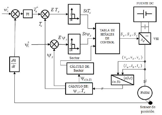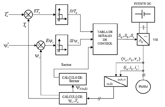 A partir de las mediciones trifásicas de corriente (ia , ib , ic ) y de los voltajes (va , vb , vc ) en el estator, se calcula el par desarrollado Te y el flujo magnético del estator ψs, estos valores son comparados con los valores de referencia e ingresan a unos controladores de histéresis que proporcionan a la salida valores discretos tanto para el error de flujo y par. Entonces de acuerdo con el plano (α β) y al sector donde se encuentre el vector de flujo del estator se selecciona un vector de voltaje adecuado para alimentar al PMSM [11], el cual es proporcionado por las señales de control (Sa; Sb; Sc ).