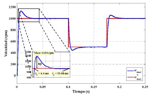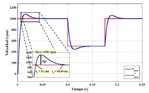 En el análisis realizado del control de velocidad cuando el PMSM arranca, se tiene que al aplicar la técnica de control DTC la velocidad producida del PMSM alcanza a la velocidad de referencia tr = 9;148ms, presenta un sobreimpulso de Mp = 8;1%, un tiempo pico de tp = 14;71ms con una velocidad de 1081 (rpm) y tiempo de establecimiento ts = 48;64ms como se observa en la Figura 10. Mientras que al aplicar el control FOC la velocidad tarda tr = 4;44ms en alcanzar a la velocidad de referencia, con un sobreimpulso Mp = 13;3% un tiempo pico de tp = 7;76ms y se estabiliza en ts = 53;08ms como se muestra en la Figura 11. Consecuentemente, se puede concluir que el comportamiento del DTC es superior al que presenta el FOC en lo que se refiere al control de velocidad.