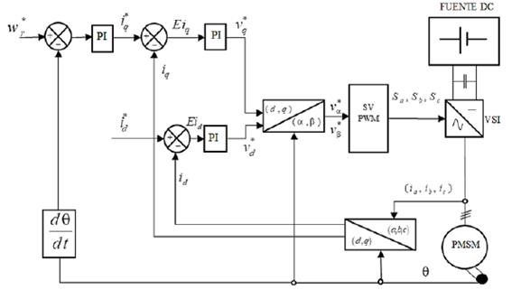 Donde Eid y Eiq son las señales de error de la diferencia de las corrientes de referencia i*d, i*q y las corrientes medidas id, iq en el eje (d; q), respectivamente; los voltajes de referencia están representados por v*d, v*q y v*α, v*β en los ejes (d; q) y el eje (α,β), respectivamente; las señales de control del VSI son Sa, Sb y Sc; y, finalmente θ representa la posición eléctrica del rotor y por ultimo las corrientes trifásicas están representadas por las variables ia, ib e ic.