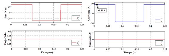 DTC: El par de referencia ingresado es el par nominal del PMSM con un valor de 27.5 (N_m),como se muestra en la Figura 5(a), donde el valor positivo de par nominal dura 0.075s, cambia a su valor negativo por un tiempo de 1s y luego cambia a su valor positivo de 0.175s hasta 0.25s. En la misma figura se muestra el flujo de referencia con un valor constante de 0.2105Wb igual al de los imanes permanentes.