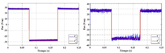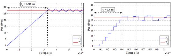 Seguidamente, en la Figura 7 se realiza un acercamiento del par de referencia y el par desarrollado en el instante en que el PMSM arranca para alcanzar el par de referencia, al utilizar el DTC el par producido por el PMSM tarda 0.328ms, mientras que al aplicar el FOC el par del PMSM tarda 0.4ms, como se observa en la Figura 7(a) y Figura 7(b).