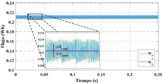 En cuanto al control de flujo en la Figura 8, se aprecia que al aplicar la técnica DTC el flujo se mantiene dentro de los límites establecidos por el controlador de histéresis. En la ecuación (10) se determinan los límites del ancho de banda del controlador de histéresis.
