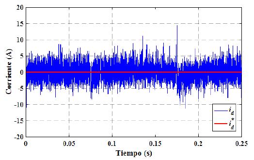 Mientras que en la técnica de control FOC como se mencionó anteriormente el control de corriente id es proporcional al control de flujo por tal motivo se realiza el control de la corriente id con un valor de referencia de 0 A. En la Figura 9 se aprecia que la corriente id medida sigue a la corriente de referencia i*d, pero con rizados que superan los 5 A. Luego de obtener los valores de rizados para el flujo magnético al aplicar las técnicas de control DTC y FOC se determinó que la técnica DTC es superior a la técnica FOC.