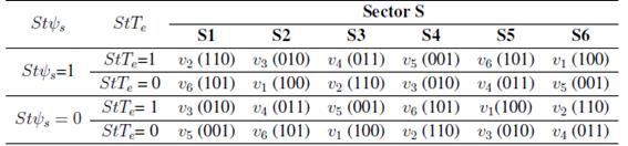 En la Tabla I, se presenta la forma de conmutación de manera que se puede escoger los vectores espaciales de voltaje adecuados según las consignas ingresadas, los vectores se escogen según una combinación del estado del sector, par y flujo 14.