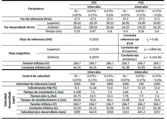 La Tabla III, se presenta un resumen completo de los valores obtenidos del control directo del par (DTC) y del control de campo orientado (FOC).