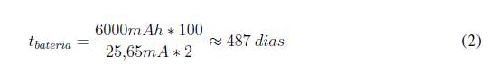 Para el análisis energético de la propuesta, se calculó el tiempo de vida util de dos baterías AA con 3000 mAh de capacidad cada una. Los valores de corriente utilizados en el análisis son valores nominales proporcionados por las hojas de datos de los fabricantes [19] [20]. El ciclo de vida util de radio (RDC, Radio Duty Cycle) queda determinado por el protocolo TSCH (Time Slotted Channel Hopping). El RDC es la relación porcentual entre el tiempo total que el radio permanece encendido y el tiempo total de funcionamiento de cada nodo, y para este diseño tiende al 2 %. Se considera despreciable para este cálculo el consumo generado por el tiempo que el radio permanece en sleep, ya que es del orden de los nanoamperes. La capacidad en conjunto de las dos baterías AA en serie según es Batería = 6000 mAh [22].