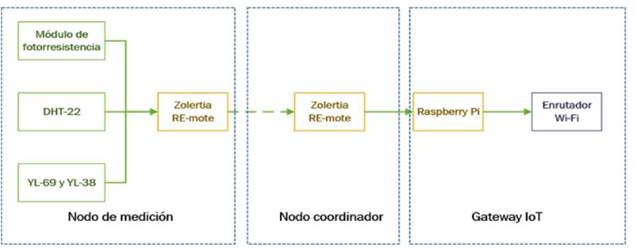 Las placas microcontroladoras que se seleccionaron fueron de compañías como Rasberry Pi y Zolertia. Para controlar los nodos de medición y al coordinador se eligió el Zolertia RE-mote, ya que permite incorporar sensores analógicos y digitales. Además, posee soporte para el sistema operativo Contiki, diseñado especialmente para aplicaciones de WSN e IoT (Internet ofthings). Soporta el protocolo IPv6, 6loWPAN (IPv6 over Low Power Wireless Personal Área Network) y el protocolo de ruteo para redes de bajo consumo (RPL, Remote Initial Program Load) que lo hacen idóneo para aplicaciones de IoT a través de redes de bajo consumo. Este microcontrolador maneja la energía de forma eficiente, lo que resulta crucial para aplicaciones de WSN. Como gateway de la red se utilizó el Raspberry Pi 3 Modelo B por contar con un soporte para tarjetas microSD para almacenar la información generada. También, presenta un puerto Ethernet, conectividad inalámbrica 802.11 b/g/n y Bluetooth, que propicia varias opciones de conectividad a otras interfaces e integra un procesador con la velocidad 1.2 GHz para dicha función.