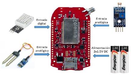 La arquitectura de hardware presento la interconexión entre los componentes que integran el diseño. En los nodos de medición (Figura 3), los tres sensores se conectaron directamente al Zolertia RE-mote y se alimentan de este mismo dispositivo. El módulo de sensor fotosensible LM393 se acoplo a un pin analógico, y envía un voltaje equivalente a la intensidad luminosa dentro de la casa de cultivo. El sensor DHT22 fue conectado a una entrada digital del RE-mote para enviar los valores de temperatura y humedad relativa. Por último, los módulos YL-69 y YL-38 se enlazaron a otra entrada analógica del Zolertia que brindo la información correspondiente a la humedad del suelo, luego de ser introducido el YL-69 bajo tierra en los canteros. En todos los nodos de medición, los Zolertia RE-mote son alimentados con dos baterías AA de 1,5 V.