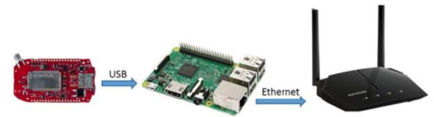 El nodo coordinador de la red estuvo compuesto por un Zolertia RE-mote. Al coordinador llego la información transmitida de un nodo a otro, en el se hacen configuraciones para el correcto funcionamiento de la red. El bloque gateway de la red estuvo compuesto por una Raspberry Pi 3 Model B conectada vía Ethernet a un enrutador Wi-Fi (Figura 4), que puede brindar servicios de conectividad a usuarios que mediante aplicaciones accedan a los datos. Implementada en esta computadora, se encuentra una base de datos que almaceno de forma ordenada los valores de las variables ambientales que envió hacia ella el nodo coordinador a través de una interfaz USB.