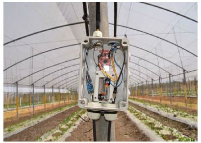 La instalación de un nodo de medición se muestra en la Figura 5 funcionando dentro de las casas de cultivo en el momento del comienzo de la adquisición de datos. Se puede observar la carcasa protectora que contiene parte del hardware del diseño de cada uno de los nodos.