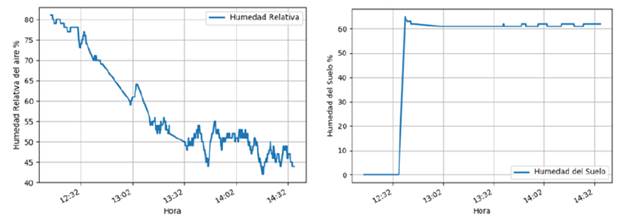 Los valores obtenidos del nodo 2 demostraron que la red se comunicó de forma correcta con el coordinador y la Raspberry, ejemplo de la prueba realizada se observan en la Figura 6 y la Figura 7 El cambio que experimentaron todas las gráficas a partir de las 12:32 am (hora de traslado de los nodos de la caseta a las casas de cultivo), evidenció la rápida respuesta de la arquitectura de hardware ante cambios bruscos. La arquitectura de software propuesta es funcional, ya que fueron almacenados en la base de datos del gateway los valores de las mediciones.