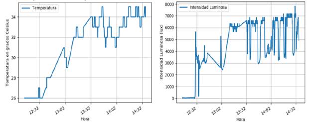 Los valores de temperatura comienzan a aumentar de 26 °C en adelante al entrar en contacto con la luz solar hasta llegar a 36 °C. Este mismo comportamiento lo presento la intensidad luminosa.
