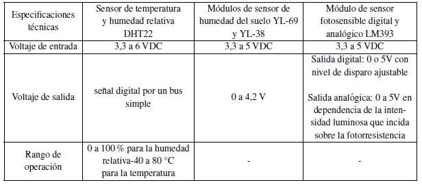 La propuesta de sistema de adquisición de datos incluyo sensores de acuerdo con sus especificaciones técnicas [19][20], la cuales se muestran en la Tabla I. Dichos sensores tienen bibliotecas en la comunidad de software libre que facilitan su uso, e interfaz de fácil conexión y comunicación.