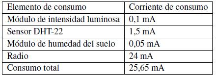 En el diseño de WSN es de vital importancia maximizar la durabilidad de la fuente de alimentación de los dispositivos, con el objetivo de reducir las sustituciones y, por tanto, de ahorrar recursos. Para el análisis energético de la propuesta se muestra en la Tabla II, el consumo total de cada nodo de medición en el momento que el radio estuvo encendido.