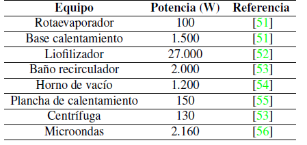 Consumo energético: Se cuantificó con respecto a lo expuesto en cada metodología. Si la información de algún equipo no se encuentra disponible dentro de la metodología, se emplea un equipo genérico con información detallada que cumpla las expectativas. Si la información de tiempos no se encuentra disponible, se estiman tiempos aproximados según la experiencia en condiciones similares.